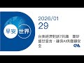 | 310 |  | 中央社 | 2026-01-29 08:15:53 | 新聞摘要 2026/01/29》台美經濟對話7共識 簽矽盛世宣言、確保AI供應鏈安全 | 生活 | 中央社 CNA|每日6分鐘 掌握天下事|中央社 - 早安世界 | 884 | 14 | 0 |