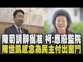 | 335 |  | 三立LIVE新聞 | 2026-01-29 13:47:50 | 陳菊辭職監察院長 網冷血圖卡瘋傳 柯:趁機廢監院 陳菊一生不畏強權為民主奮鬥 請辭監察院長遭政治操作│記者 廖品鈞 江文賢│新聞一把抓20260129│三立新聞台 | 463 | 1 | 5 |